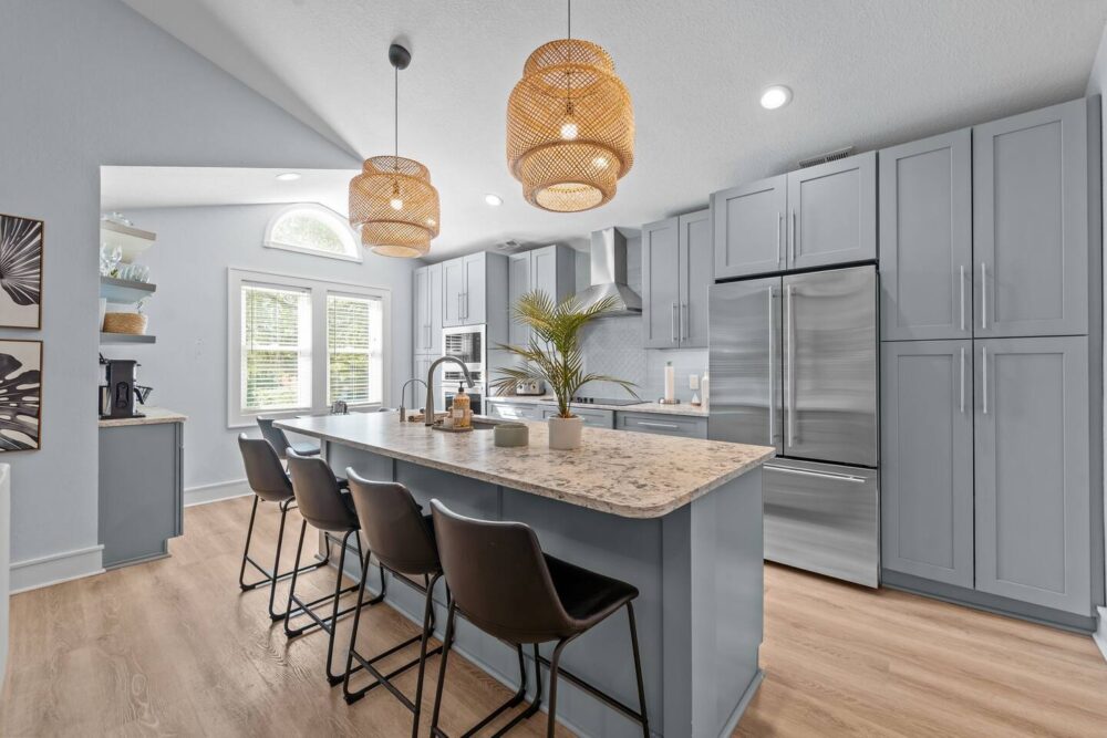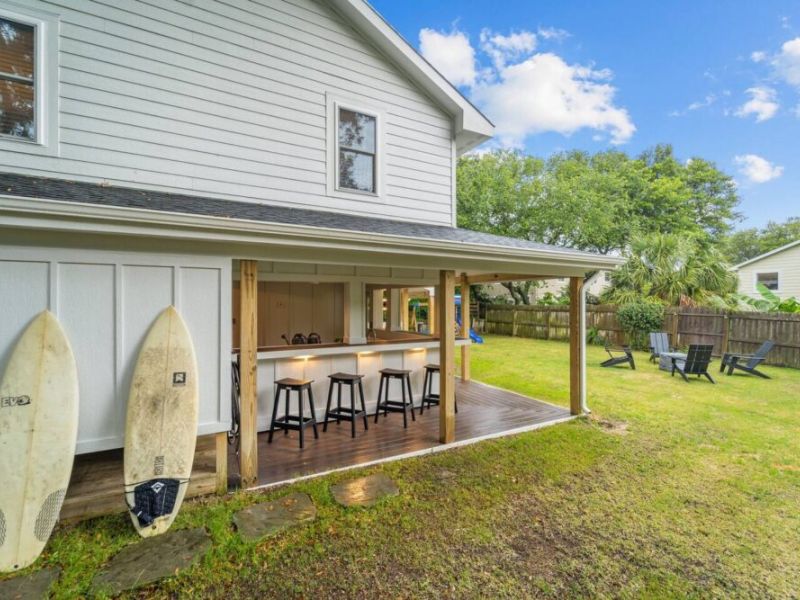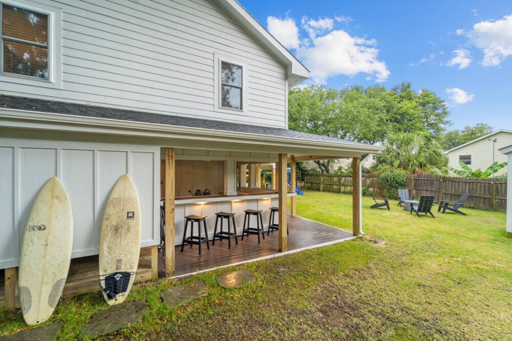 The fenced-in yard is a fantastic spot for gatherings, complete with an outdoor grill and bar area—ideal for enjoying meals together after a fun-filled day at the beach.