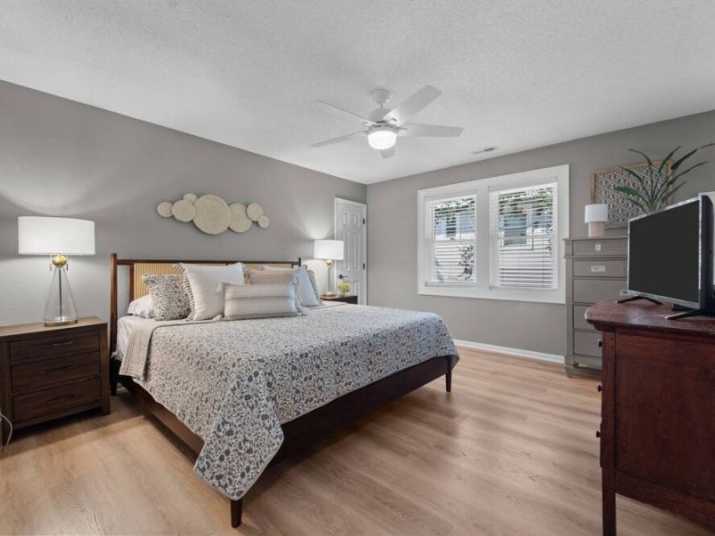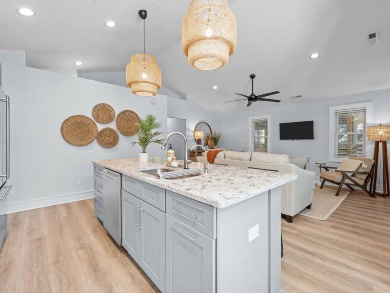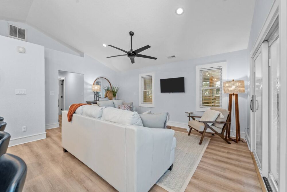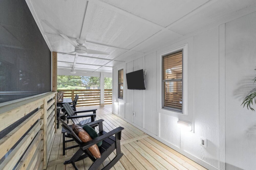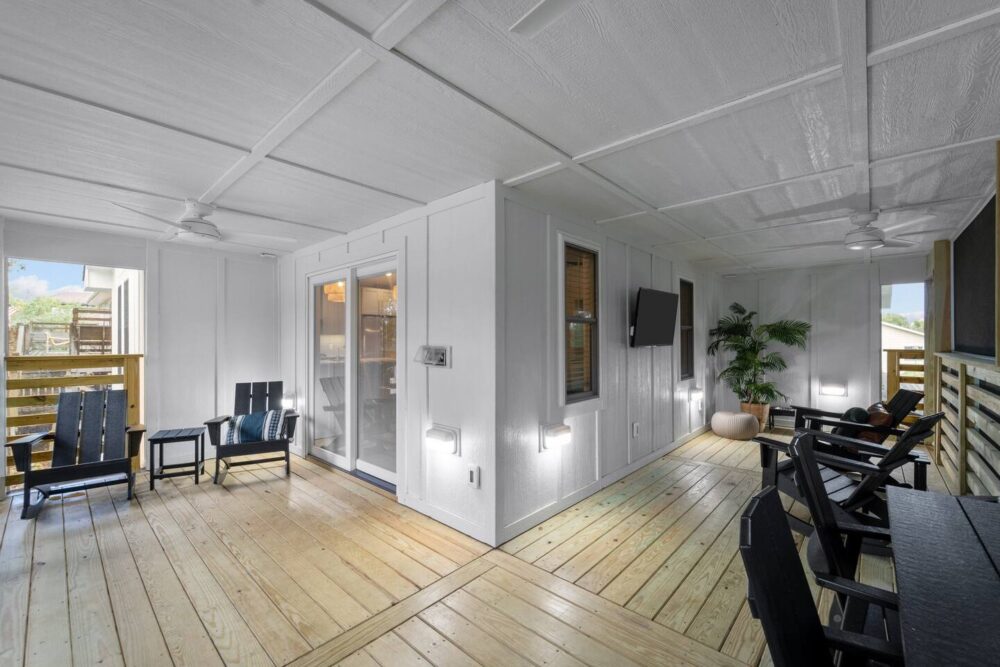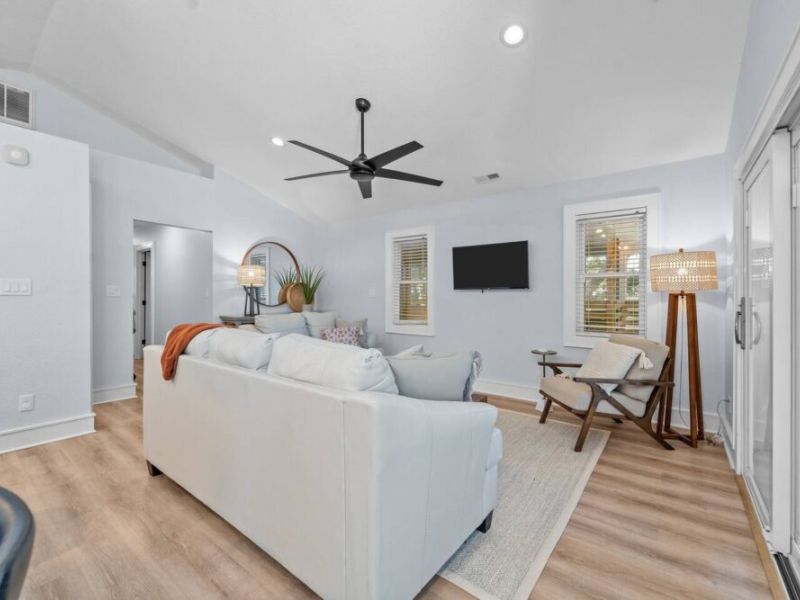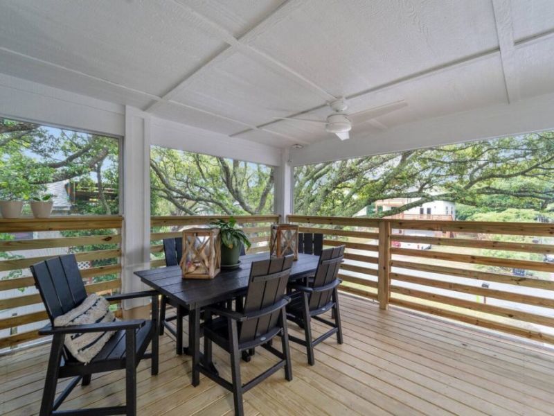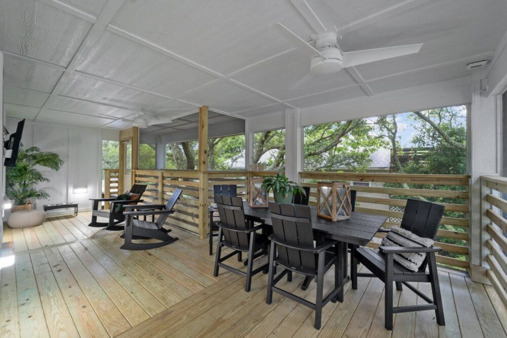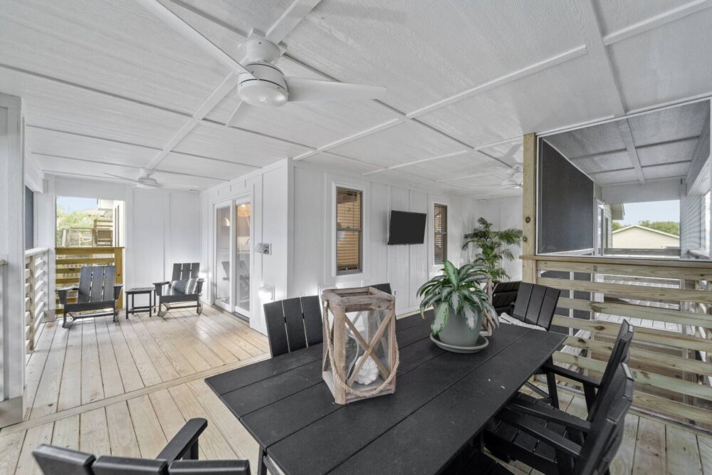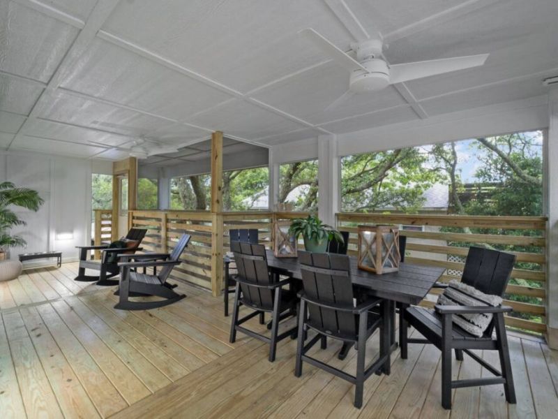 With four spacious bedrooms and three bathrooms, Hideaway on Helga comfortably accommodates up to eight guests. The home features three primary suites, each with a private bathroom, ensuring comfort and privacy for everyone in your group. The top-level living room opens onto a wrap-around, screened deck, providing a delightful outdoor living space where you can relax and take in the fresh sea air.