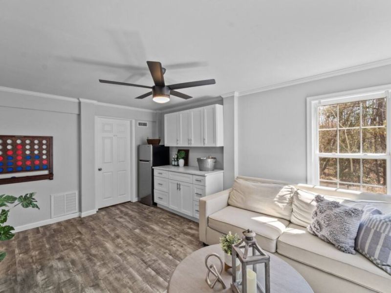 -Spacious game room with pull out couch and kitchenette.