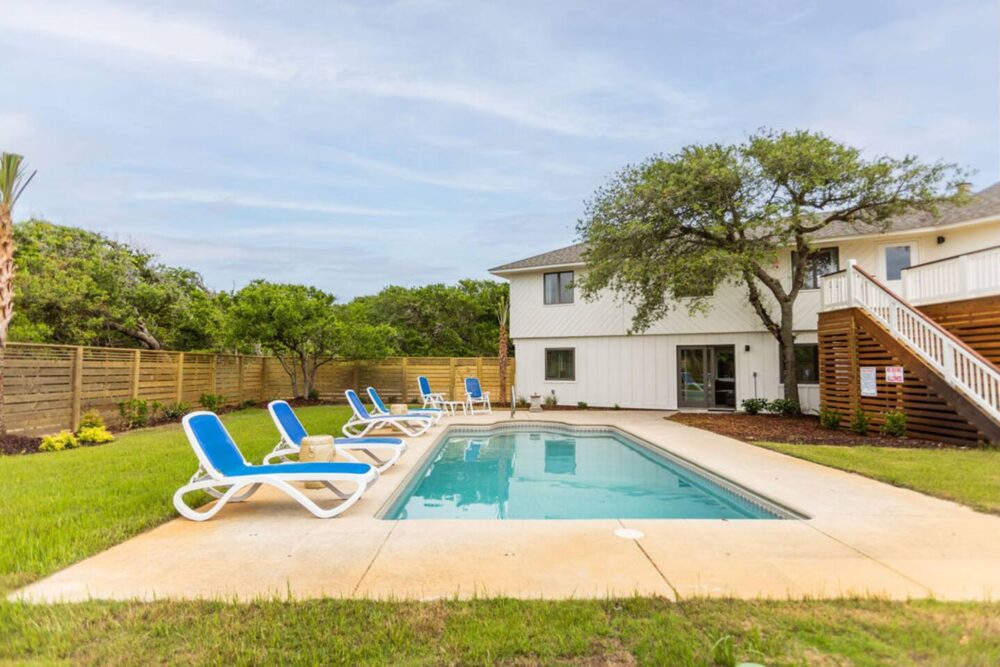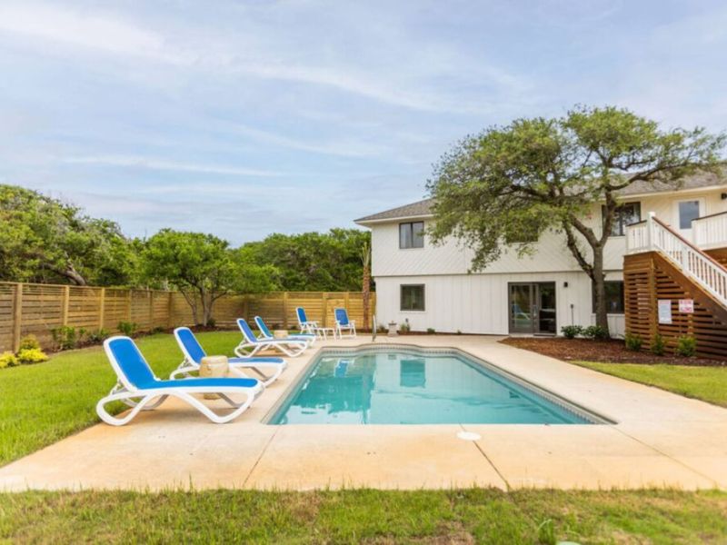 After a quick walk to the beach, rinse off in the outdoor shower, then unwind by the private pool in your spacious backyard oasis.