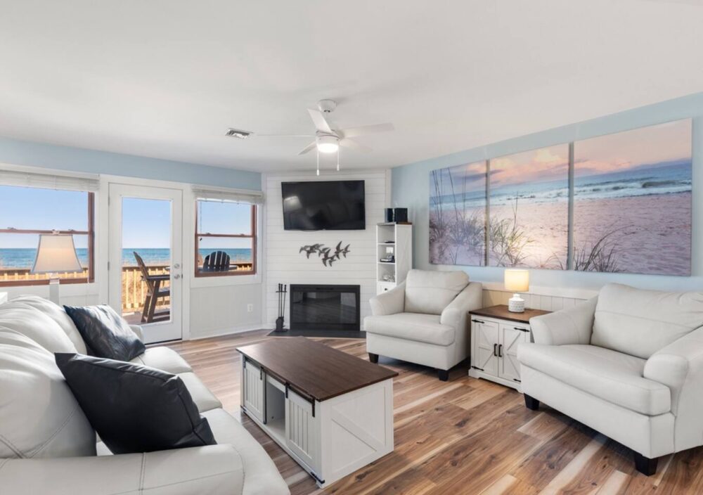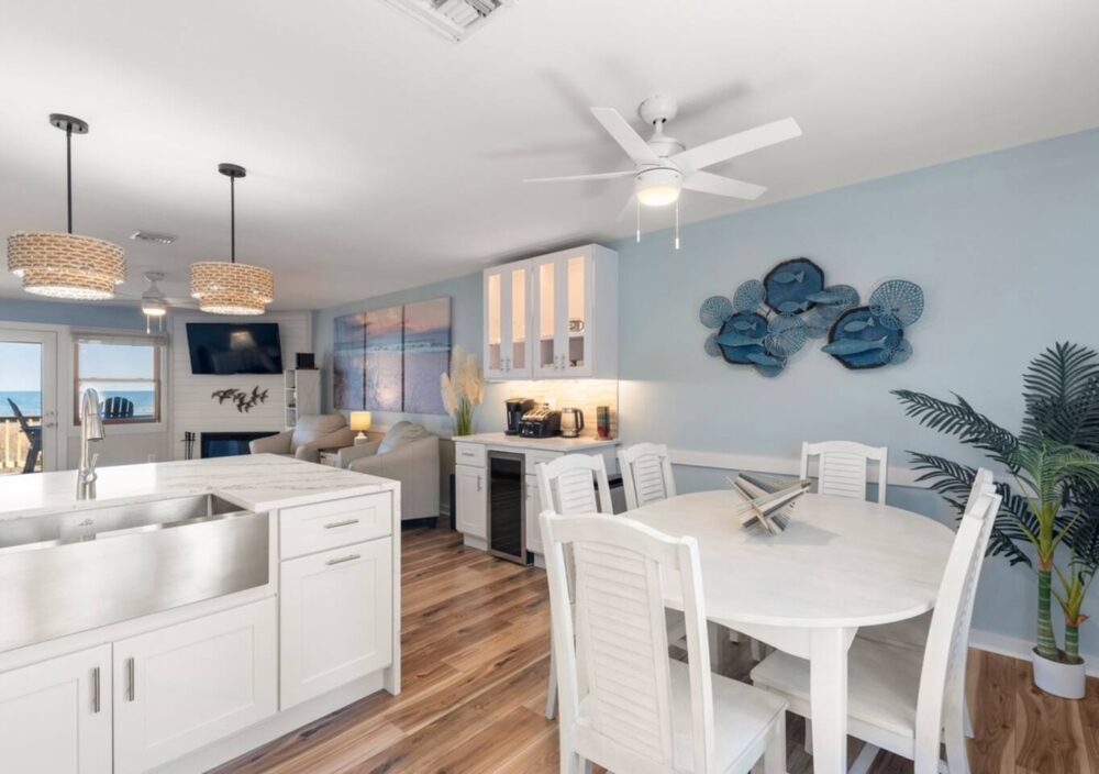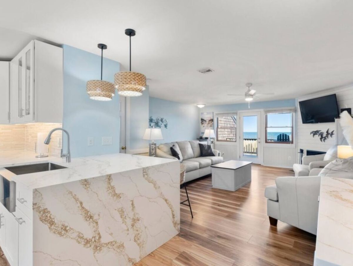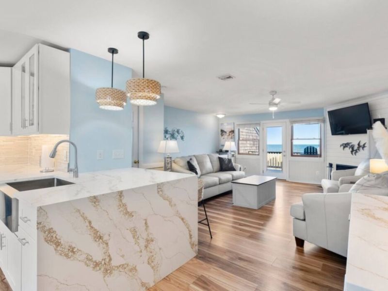 Nestled oceanfront in Nags Head, Ohana is a completely renovated two-bedroom, 2.5-bath townhome that blends modern luxury with laid-back beach living. From the moment you step inside, you’ll notice every detail has been thoughtfully elevated—from the quartz countertops and custom cabinetry to the new stainless steel appliances and wide-plank flooring. No corner was left untouched in this high-end coastal refresh.