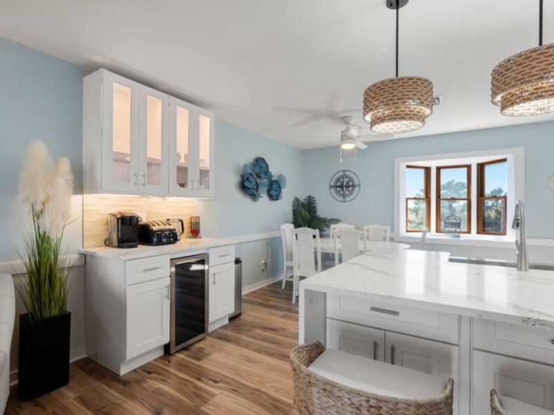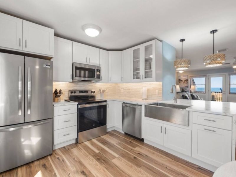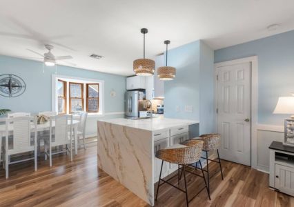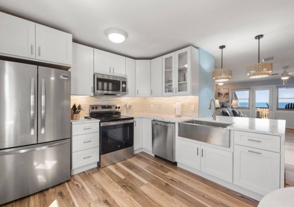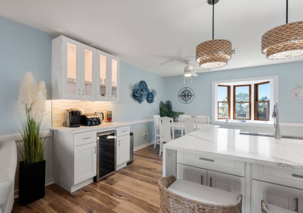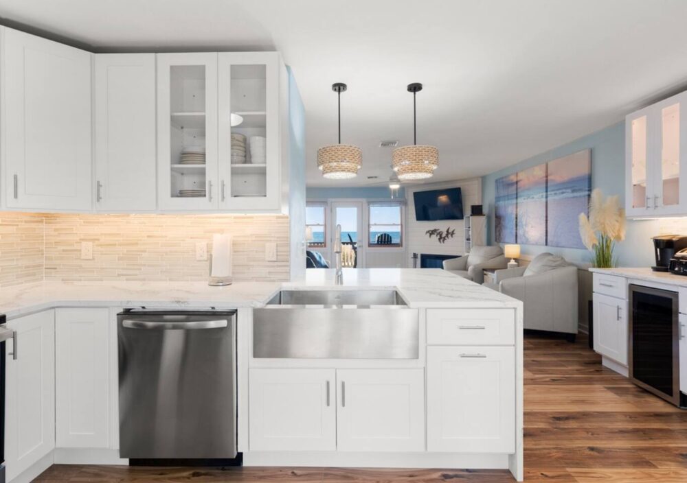 Nestled oceanfront in Nags Head, Ohana is a completely renovated two-bedroom, 2.5-bath townhome that blends modern luxury with laid-back beach living. From the moment you step inside, you’ll notice every detail has been thoughtfully elevated—from the quartz countertops and custom cabinetry to the new stainless steel appliances and wide-plank flooring. No corner was left untouched in this high-end coastal refresh.