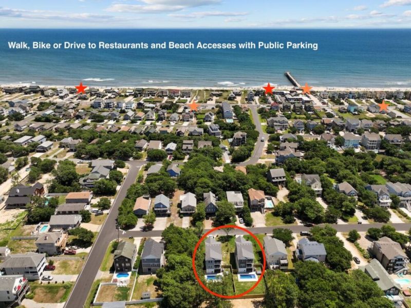 BRAND NEW Nags Head Retreat with Pool, Game Room, and Private Suites! Only .4 or 8 minute walk or 2 minute drive to the ocean access via Bainbridge Street or Nags Head Fishing Pier. Amble beach parking. >Professionally Designed< Next to twin cottage 'Park and Paddle'.