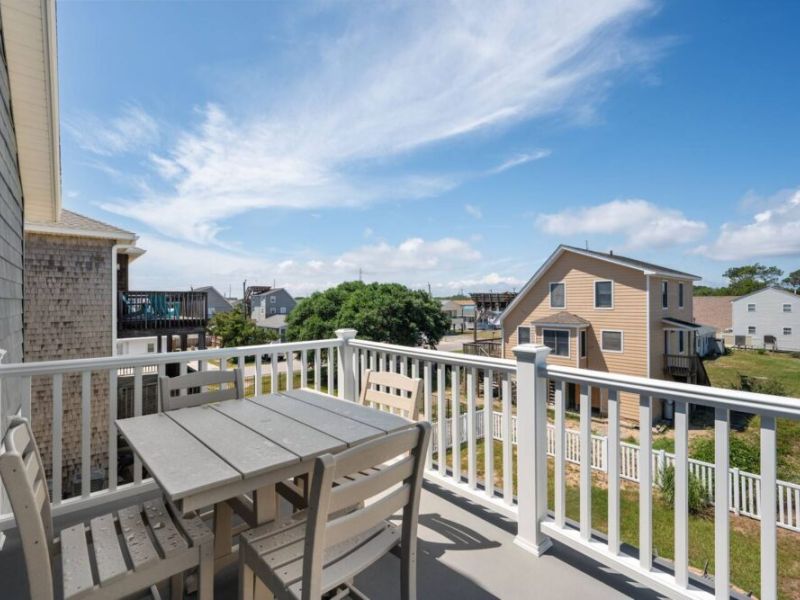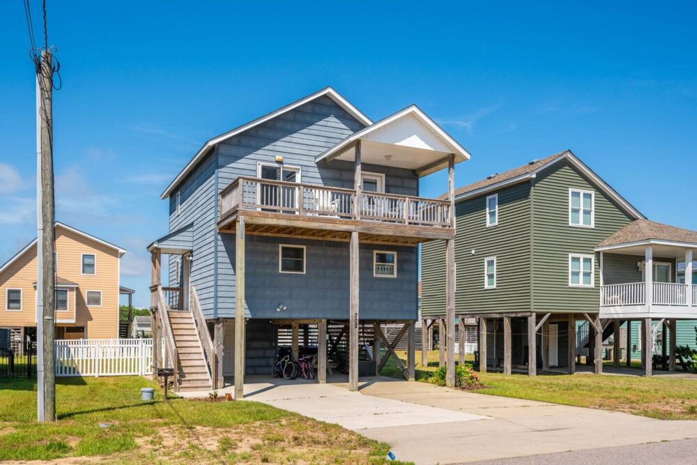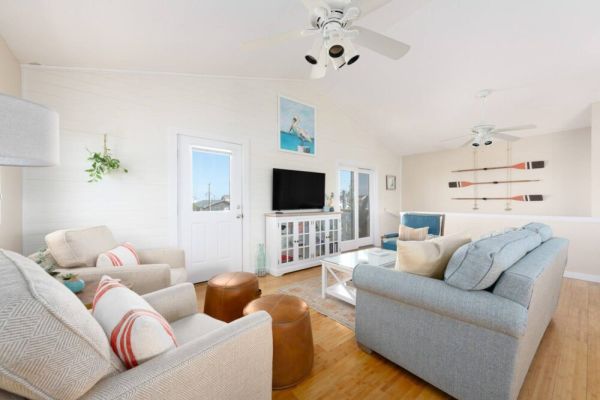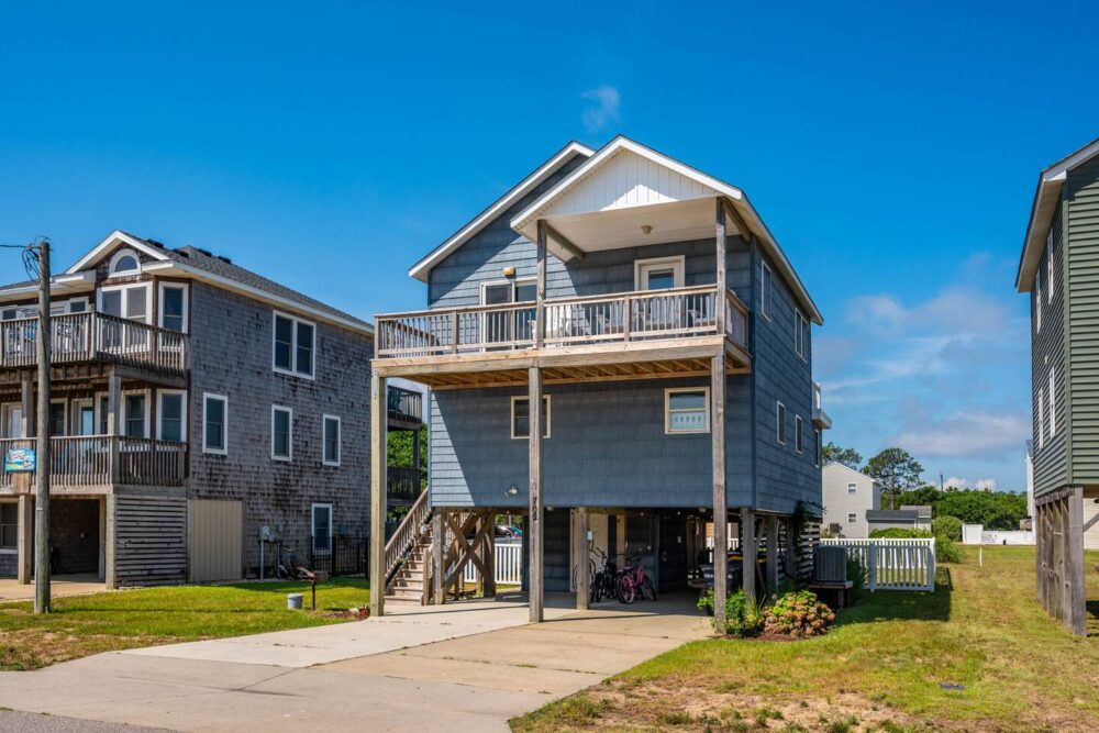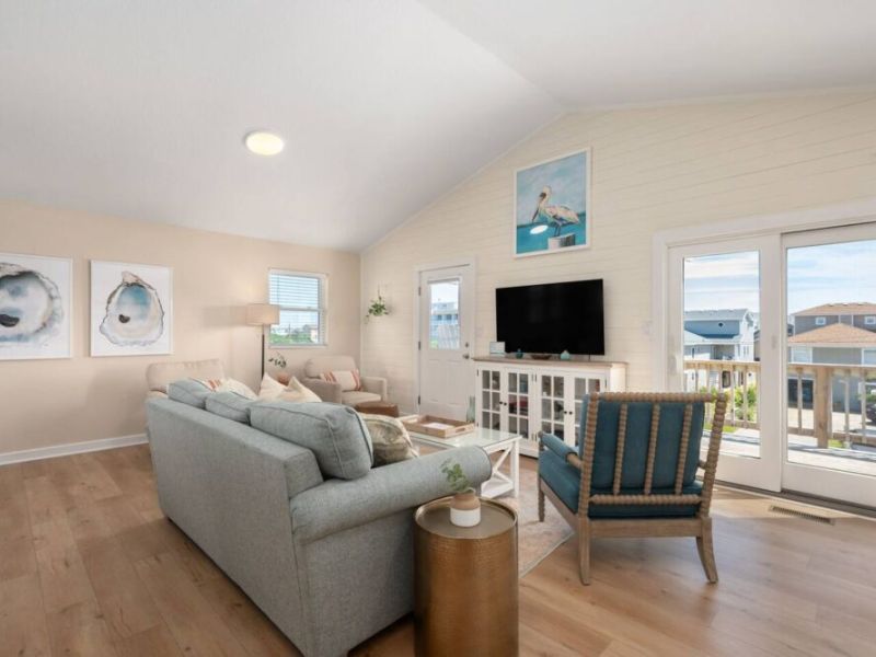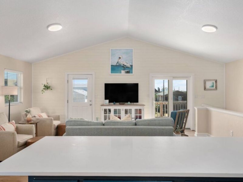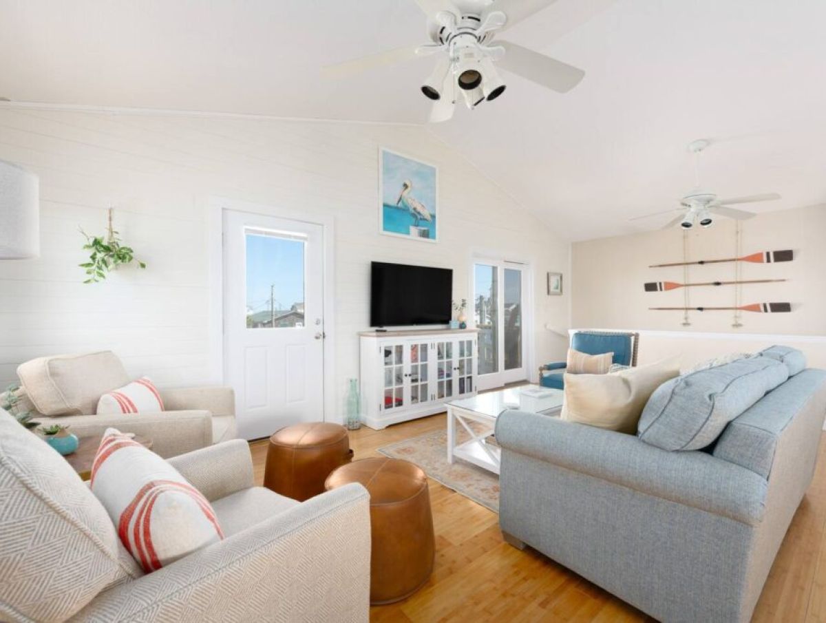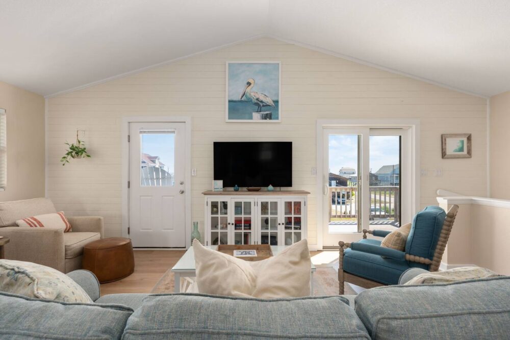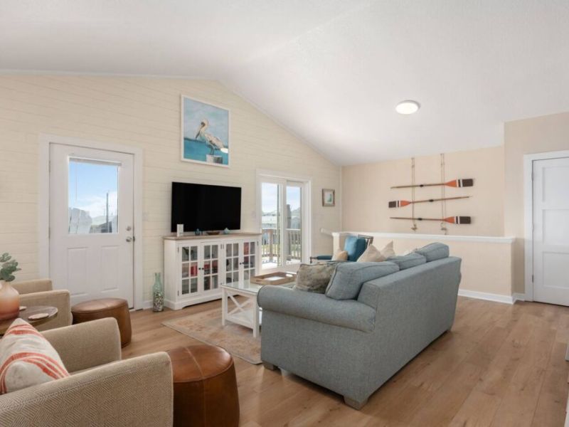 Upstairs, you’ll find the open-concept living area with a fully equipped kitchen, ideal for cooking fresh coastal meals and gathering around the dining table. Step out to the front deck with your morning coffee to watch the sunrise over the Atlantic, or enjoy dinner on the rear porch surrounded by ocean breezes.