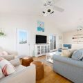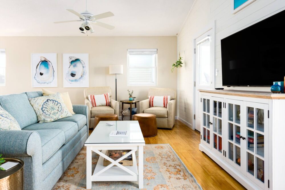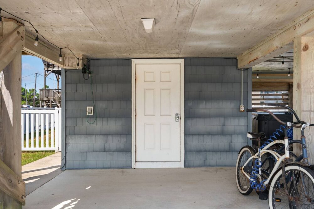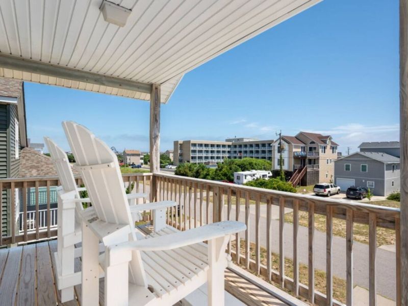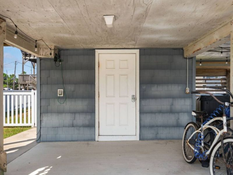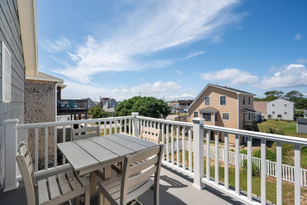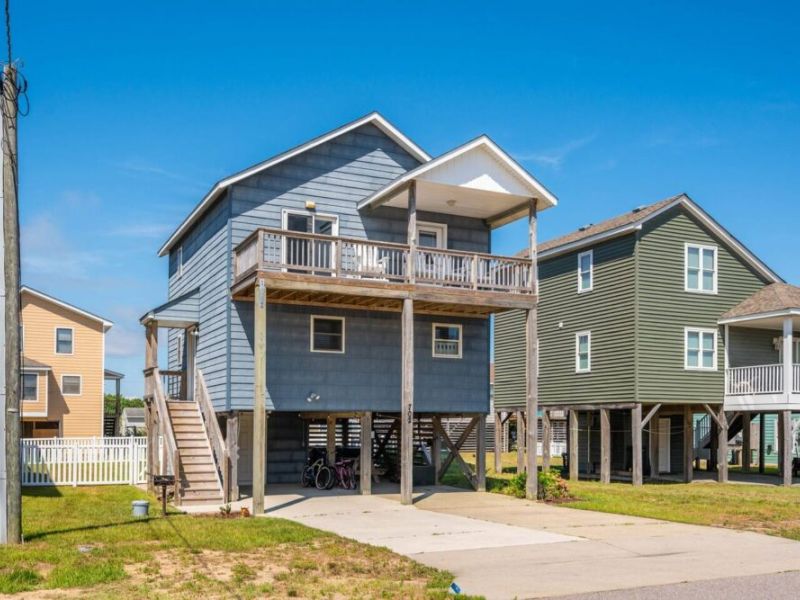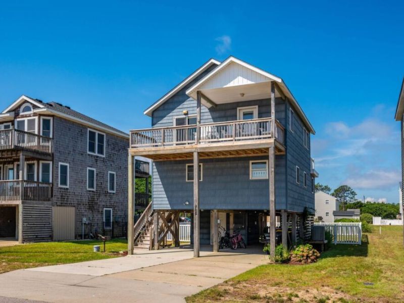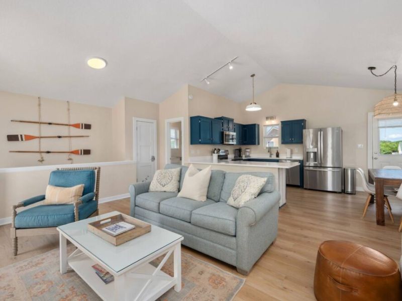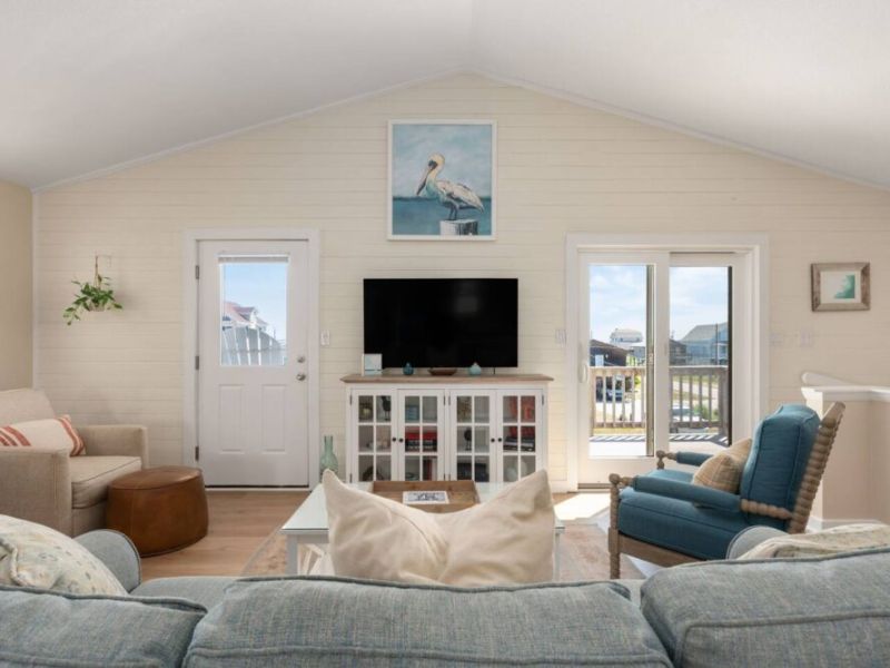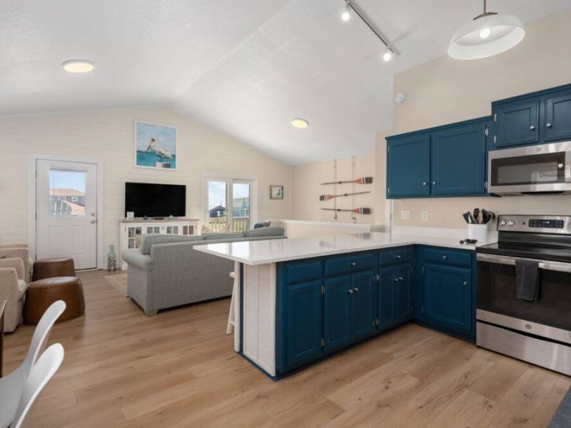 Upstairs, you’ll find the open-concept living area with a fully equipped kitchen, ideal for cooking fresh coastal meals and gathering around the dining table. Step out to the front deck with your morning coffee to watch the sunrise over the Atlantic, or enjoy dinner on the rear porch surrounded by ocean breezes.