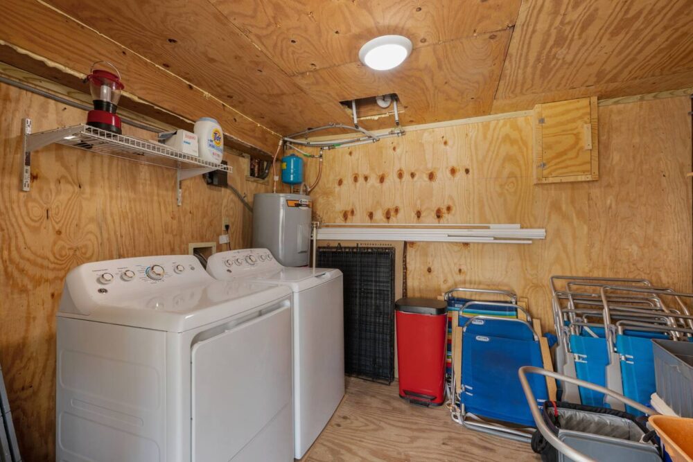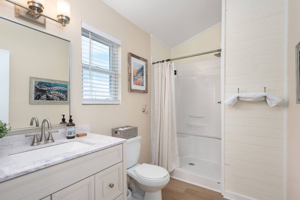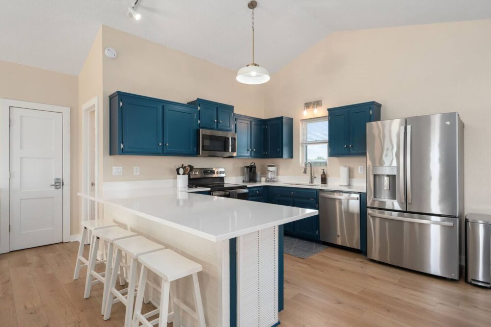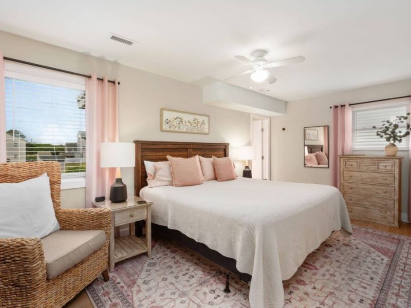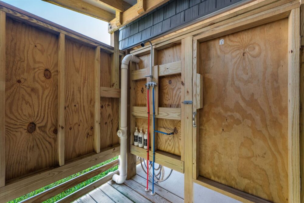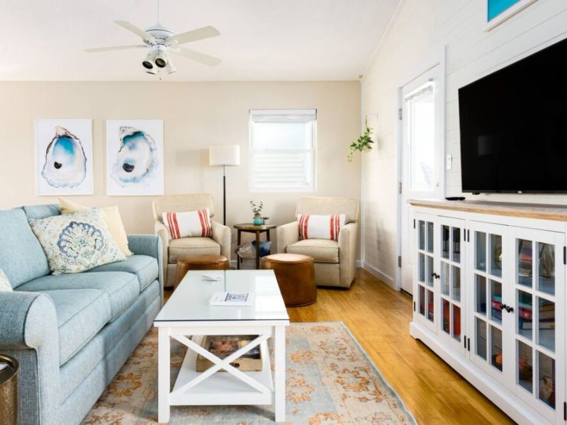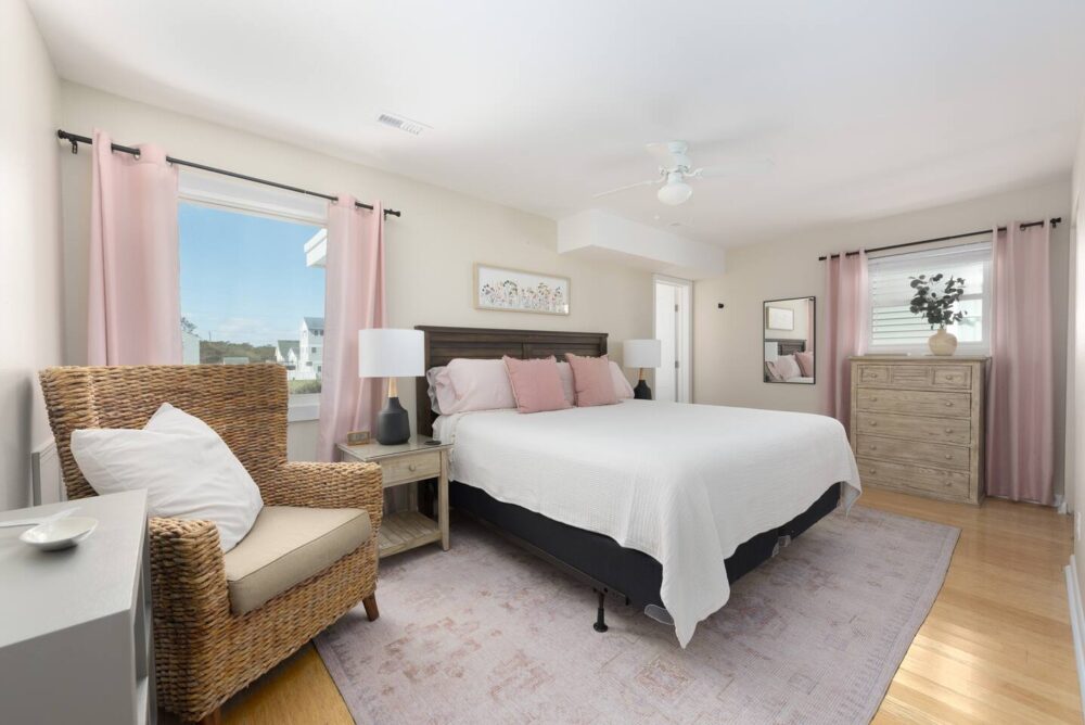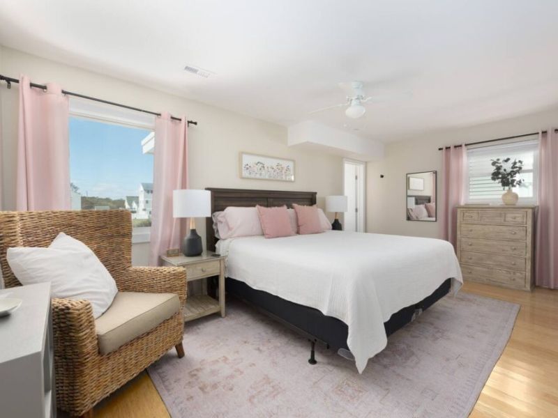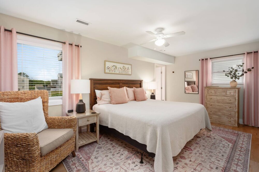 Upstairs, you’ll find the open-concept living area with a fully equipped kitchen, ideal for cooking fresh coastal meals and gathering around the dining table. Step out to the front deck with your morning coffee to watch the sunrise over the Atlantic, or enjoy dinner on the rear porch surrounded by ocean breezes.