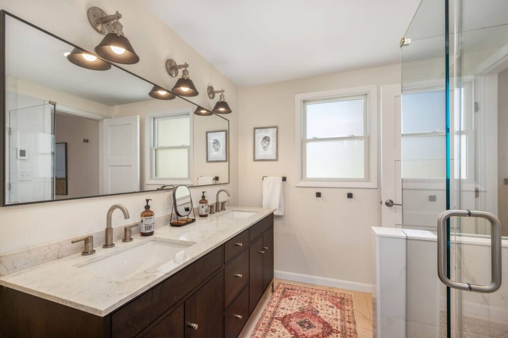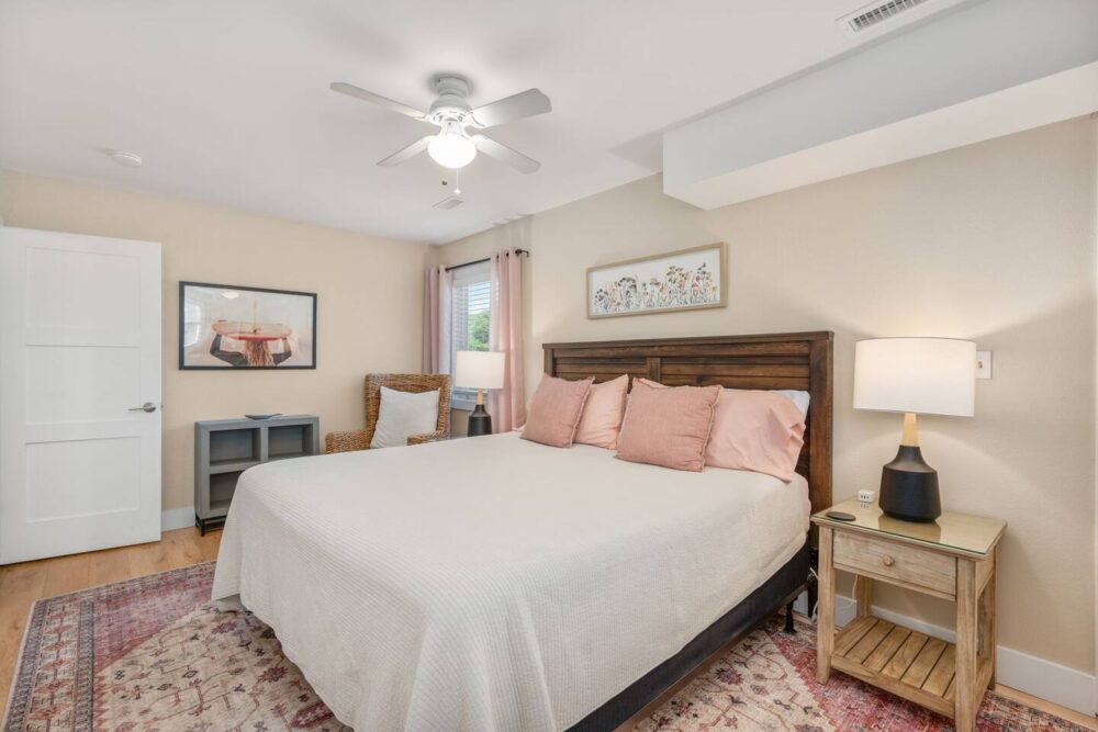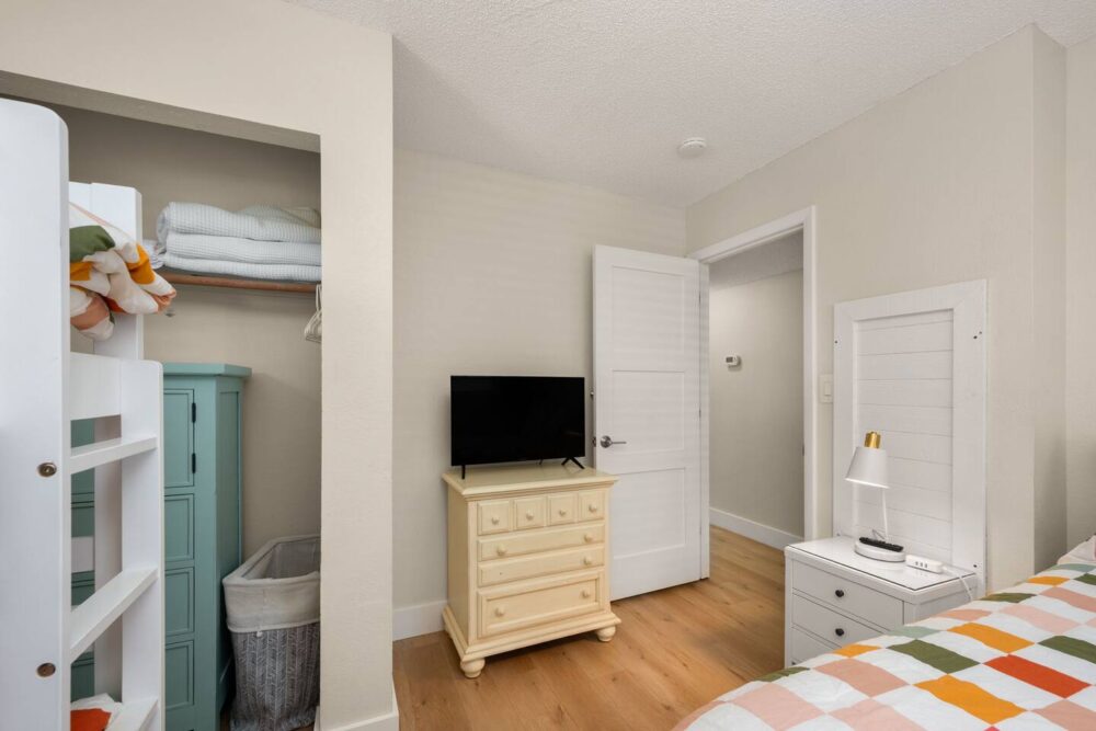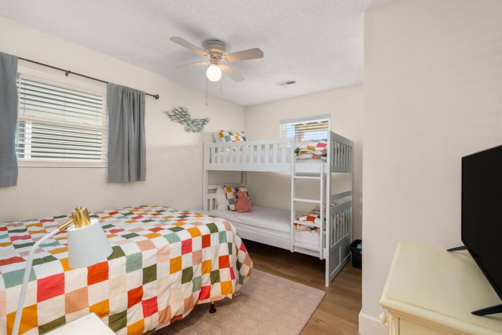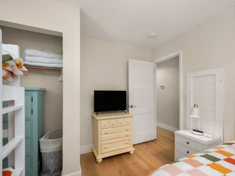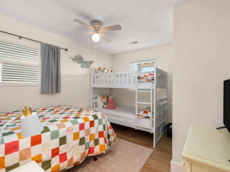 The spacious primary suite features a high-end bathroom designed for total relaxation, while all bedrooms— including a fun kids’ bunk room—are conveniently located on the middle level for peace of mind when traveling with family or friends.